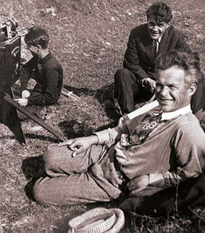 Олександр Довженко, Лазар Бодик (дивляться у об’єктив) і Василь Хмурий (поруч із кінокамерою) на зйомках фільму «Земля». Світлина із газети «Зоря Полтавщини».